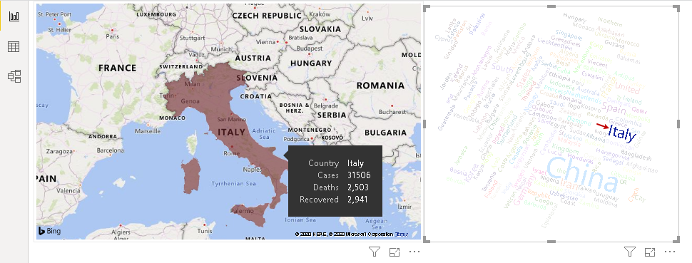 We can click on a particular country and the map chart zooms over that particular country. For example, let’s click on Italy, and it changes the visual as shown below.
