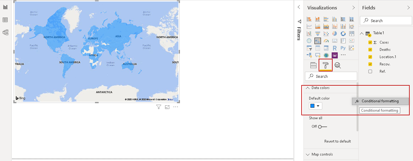 Currently, The Power BI Desktop report shows different colors for each country. We can define a color coding for better visualization. Go in the format area and click on Data colors-> Conditional formatting.