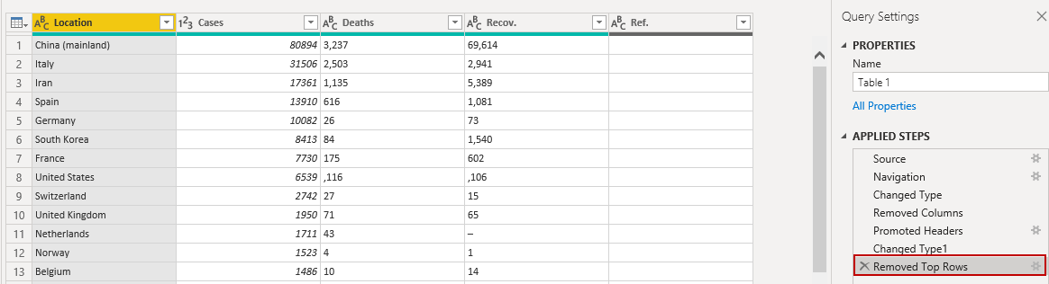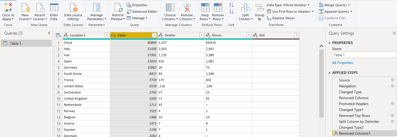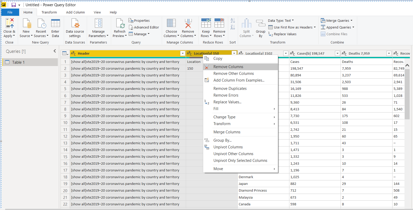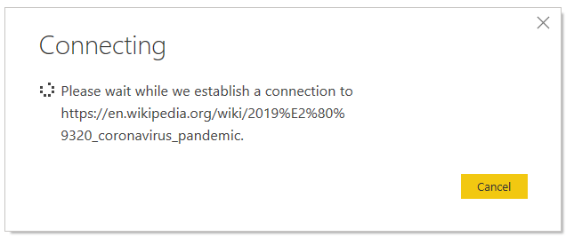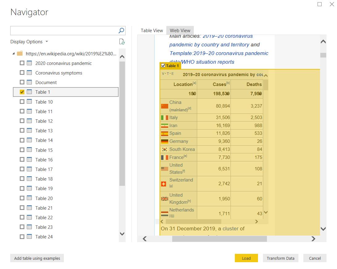 For this article, I am taking data from the 2019–20 coronavirus pandemic page of Wikipedia. First, let’s import the data into Power BI dashboard. Our data is in a web page so we can use a web data source. Launch Power BI Desktop and click on Get Data -> Web
