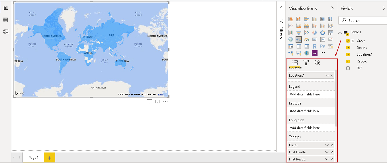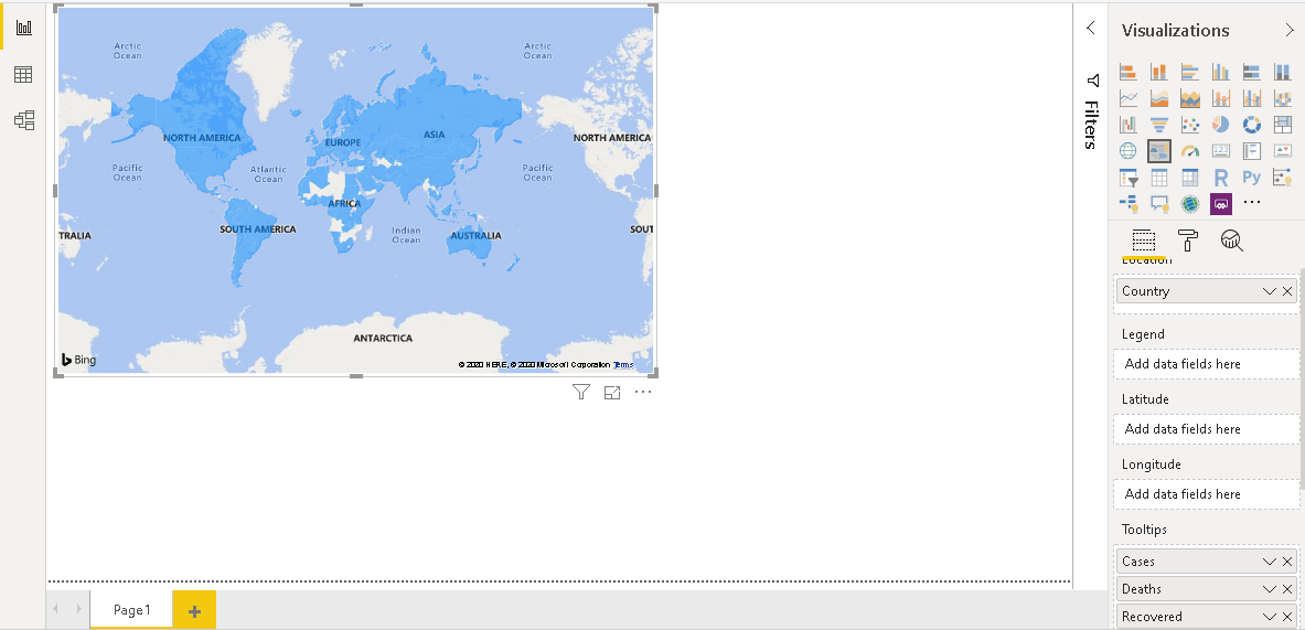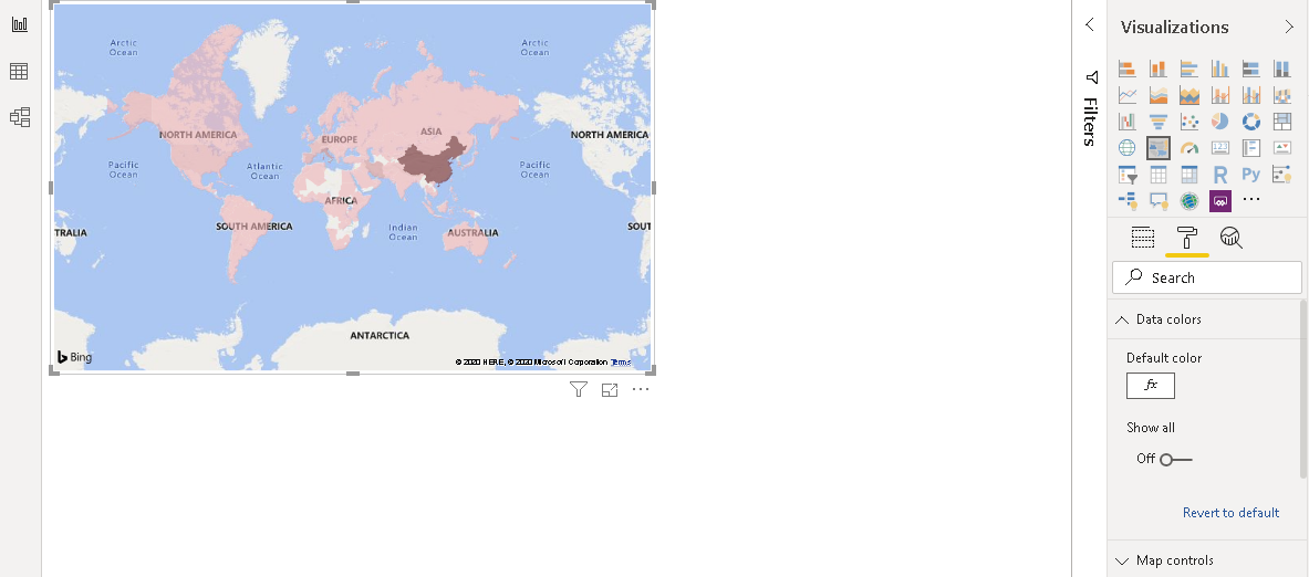 Click on a filled map visualization icon, adjust the position of the map visual and drag the fields into field map data columns as shown below. We get the following visual in the report.