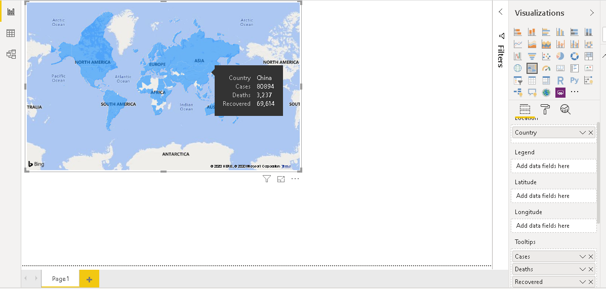 Now, you can visually distinguish the country based on the color code. For example, it shows the darkest color for China that is most impacted.