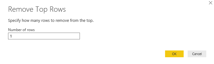 We need to remove top rows as well in the data. Click on Remove Rows-> Remove Top Rows and specify 1 in the number of rows as shown below.