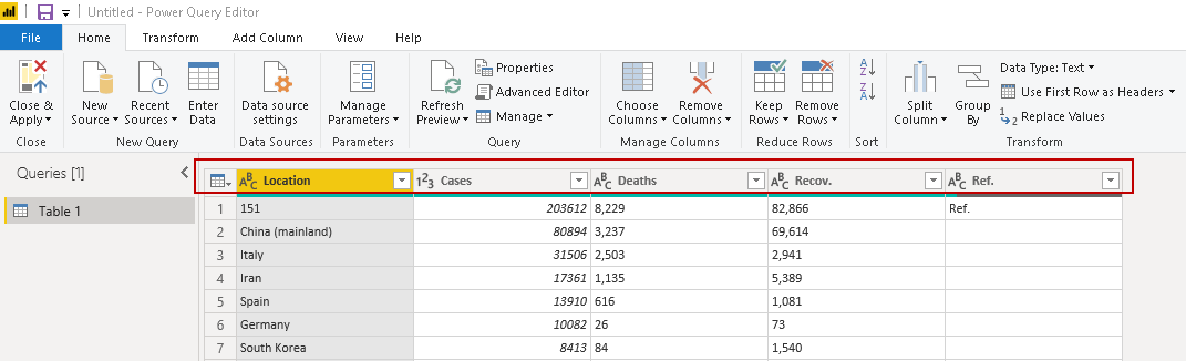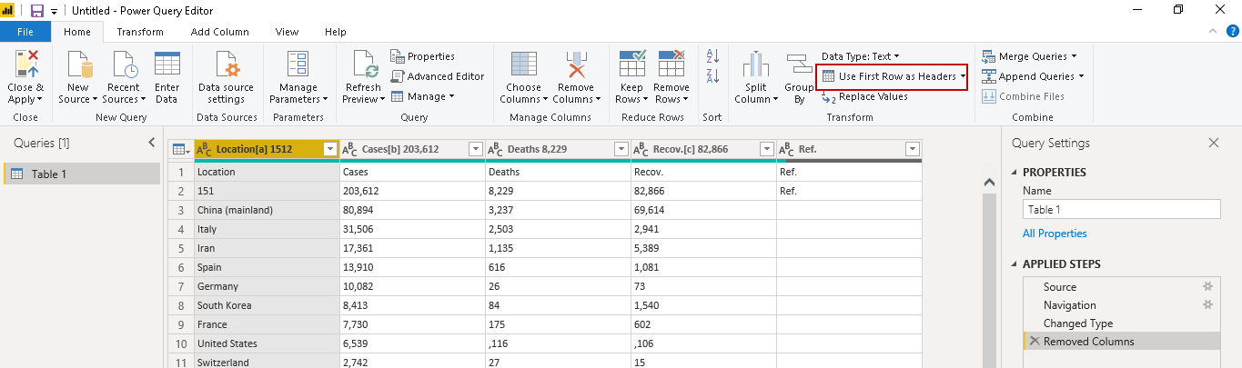 Once we removed the unwanted columns, we can make the first row as the column header. Click on Use first row as header as shown below.