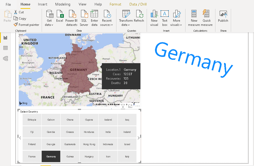 Now once we have done the formatting, click on a tile in the slicer. For example, once we click on Germany, it changes the Word Cloud and maps visually for that country.