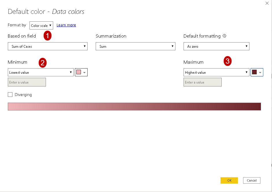 Here, select the field such as cases and select the color range for the minimum to maximum values. You can choose the color coding as per your requirements.