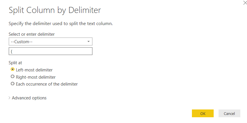 In the split column by delimiter menu, click on custom and specify small bracket[(] as a delimiter. We can use left-most delimiter in this case as it will split the text on the first occurrence of a small bracket.