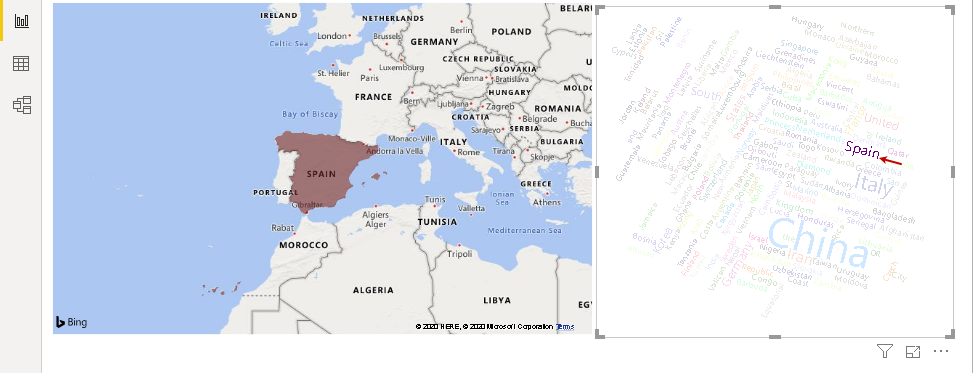 Similarly, click on Spain and map zooms over Spain. You can click on a blank area in the Word Cloud to move back to the original state.