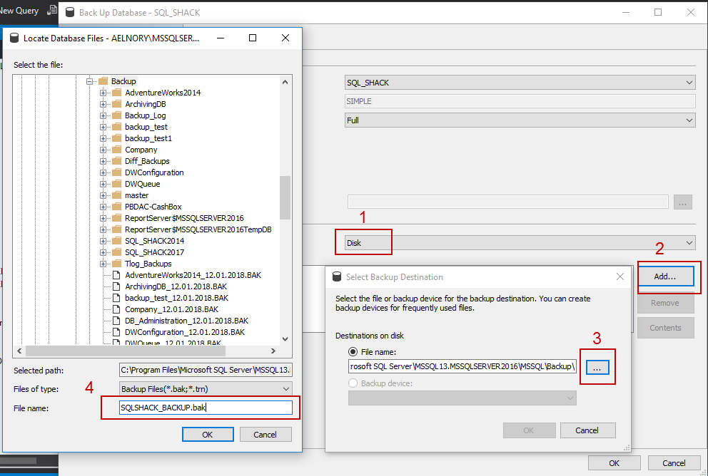 Backup to disk: here you can choose the folder and file name for your backup on local disk or share location or your registered backup devices.
