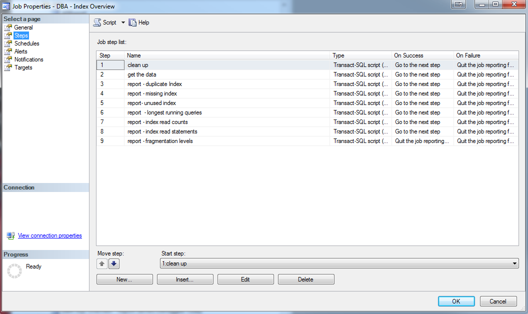 The SQL Agent Job ties the entire process together by calling steps 2-4 above. I usually call this job ad-hoc when someone complains about performance, however you could schedule it as well. Again, just a warning the data is only valid between server restarts so if you restarted the server a day or two ago your data will not be as rich as data collected after a month between the last server restart, so be wary of restarts. Below is what the SQL Agent Job looks like: