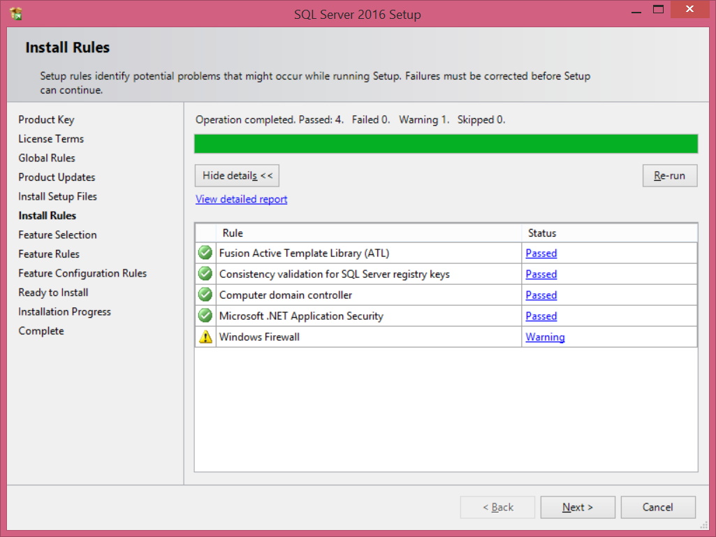 The Feature Rules check will be automatically skipped if there is no error. One thing that still not enhanced here is that you still have to install the .NET Framework 3.5 manually as it is not installed automatically within the setup and pre-installation files.
