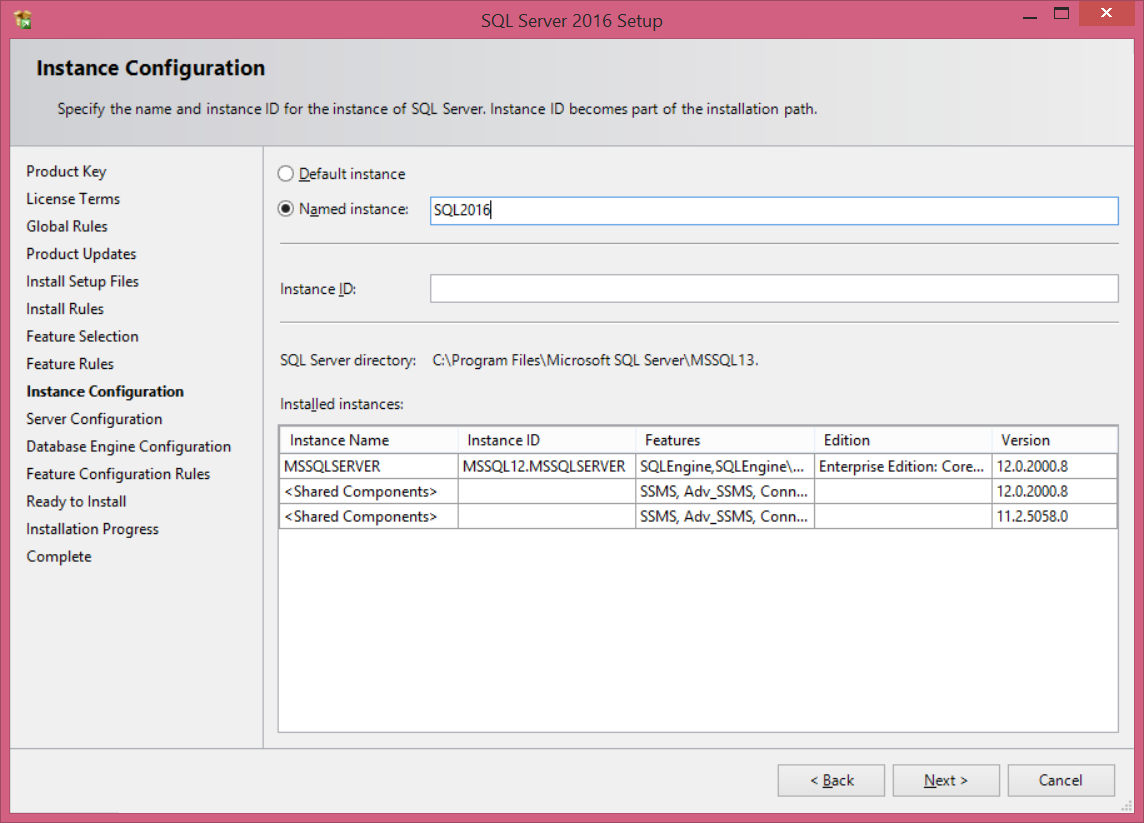 In the Instance Configuration window, you have the choice to install a default SQL Server instance or install a named instance if there is a default instance installed previously. If you choose to install a named instance, specify a name for that instance. You can see also a list of installed SQL Server instances on the current machine as follows: