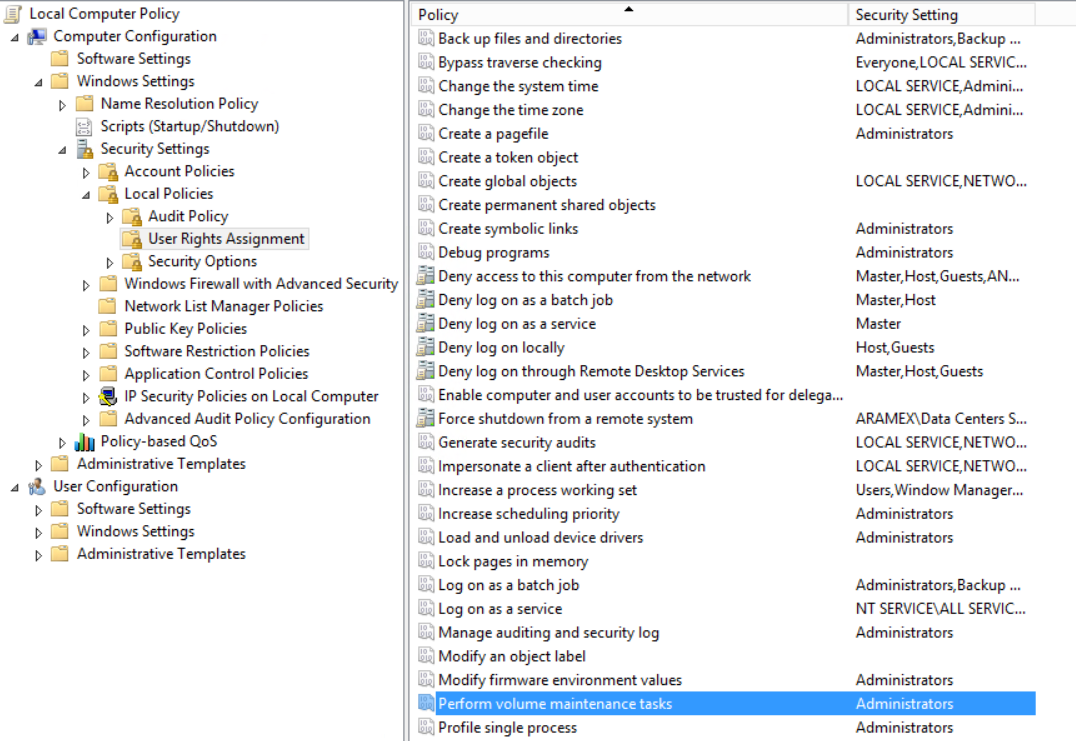 What is different here from the previous SQL Server versions is the ability to enable the Instance File Initialization, which is used to reclaim the used disk space without filling that space with zeros. Previously, this feature is enabled by adding the SQL Server Service account to the Perform Volume Maintenance Tasks policy from the User Rights Assignments of the Security Setting as follows: