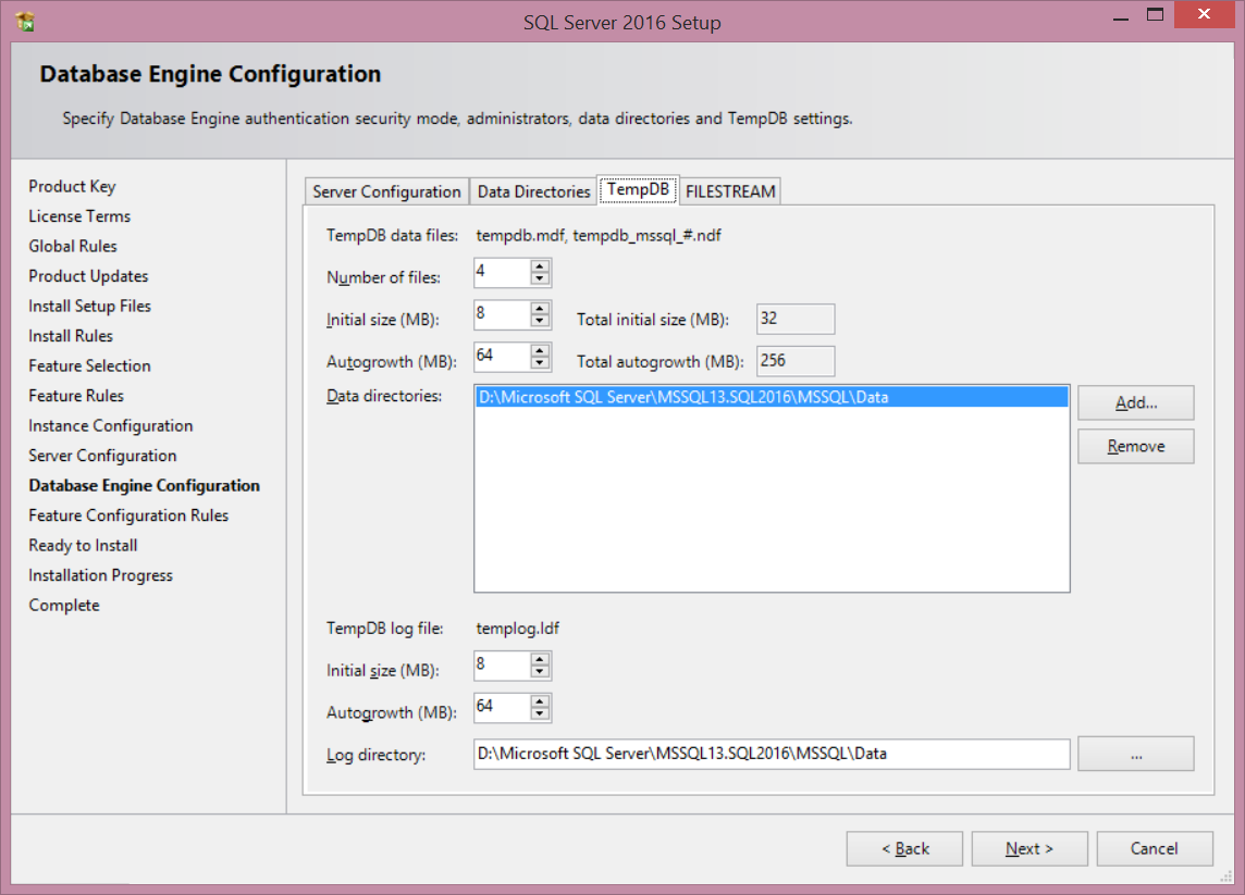 In the previous SQL Server versions, it was one of the database administrator’s tasks to configure the TempDB with multiple data files based on the number of server cores after the SQL Server installation. In SQL Server 2016, a new tab is added to the Database Engine Configuration window that enables you to specify the number of TempDB data files, the initial size, growth and directory for the data and log files.