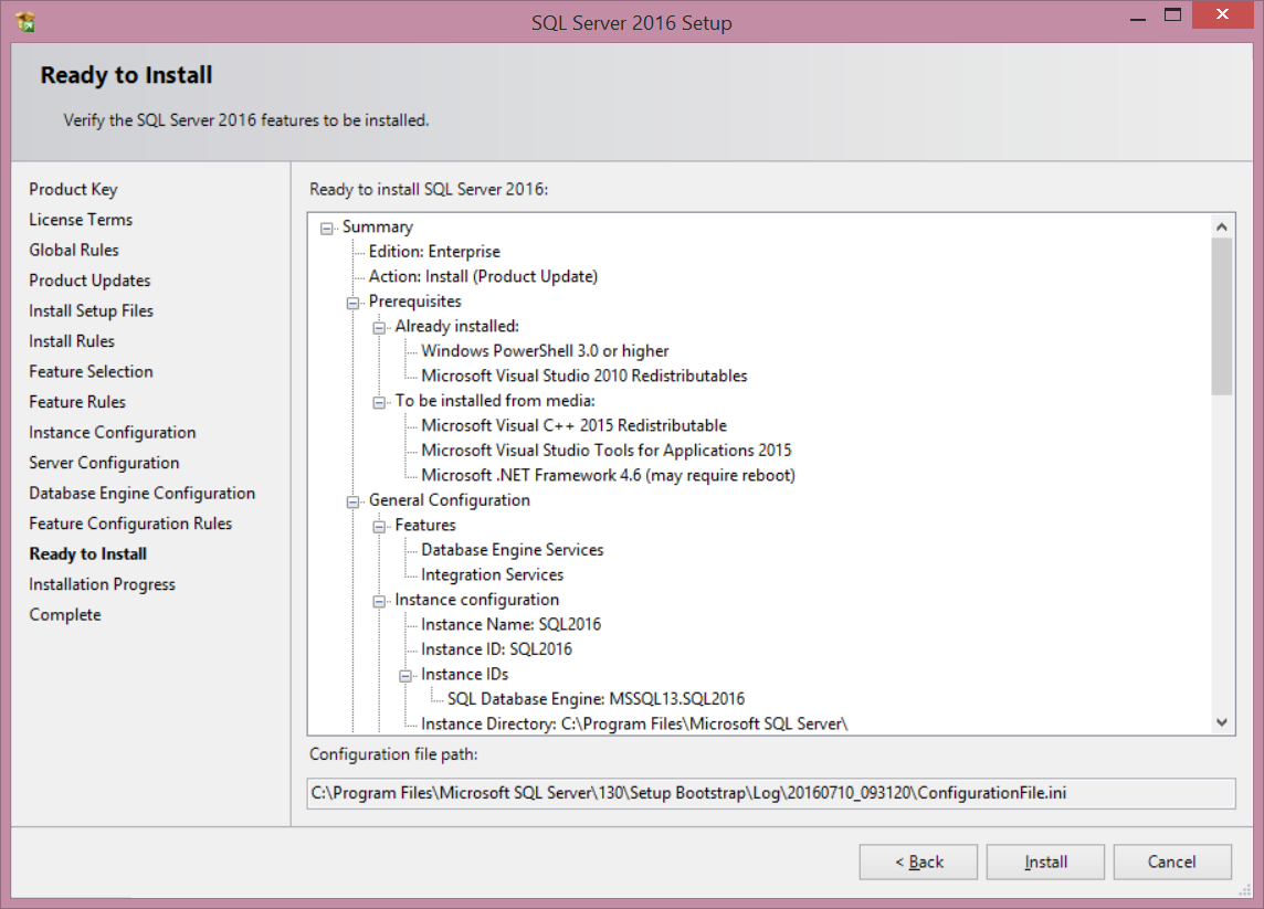 If there is no issue, the Feature Configuration Rules page will be skipped to show the Ready to Install window. Review the installation options that were specified during the setup process and click Install to start the installation process.
