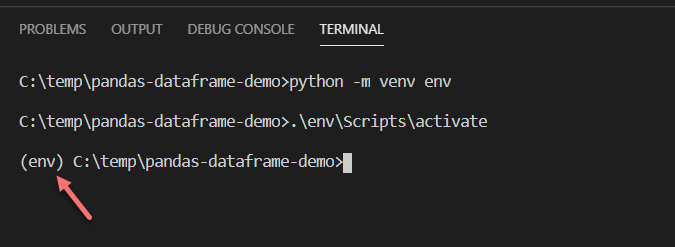 Although, I have discussed installing pandas before, let me provide a quick recap on how to install the same. Also, we will use a virtual environment for the purpose of this tutorial. So, let us go ahead and create a virtual environment first. Create a directory where you want to place your code and open the VS Code. You can use the following command to create and activate the virtual environment.