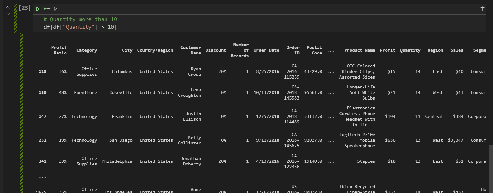 Now that we know how to select a subset of the dataframe by specifying column names, let us explore how to filter the pandas dataframe using conditions. Filtering is almost similar to how we do for relational tables. We can filter records by specifying the conditions as mentioned below.