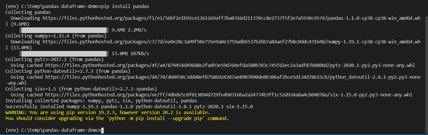 Now that the virtual environment has been activated, let us go ahead and install pandas in this environment. Use the following command to install pandas.