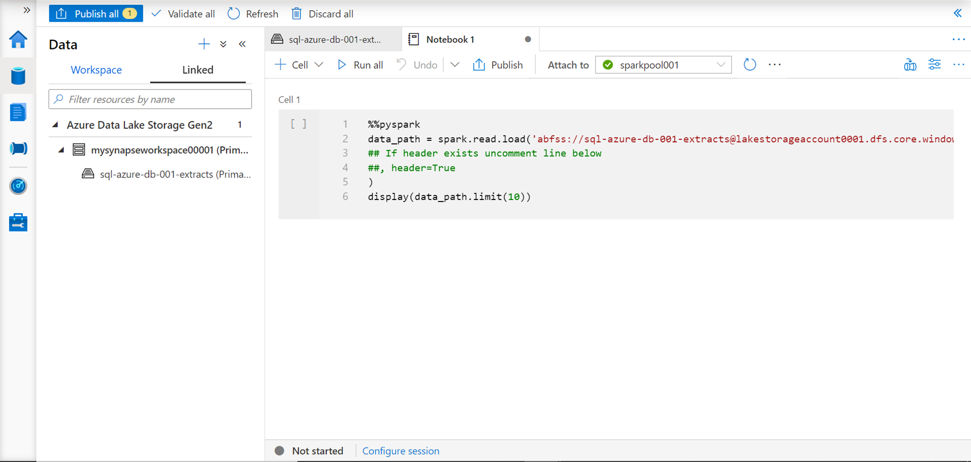 This would open a new tab in the explorer pane as shown below. If you look at the “Attach to” dropdown, you would find the name of the spark pool listed in it. Using the same notebook, one can also connect to a different pool. For now, we only have one spark pool, so we would be using the same. The script is created using Pyspark as shown below. The script just uses the spark framework and using the read.load function, it reads the data file from Azure Data Lake Storage account, and assigns the output to a variable named data_path. Once the data is read, it just displays the output with a limit of 10 records. This script can be modified as required before executing or publishing.