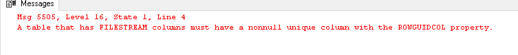 Step 4: ADD FILESTREAM Column to an existing table: In this step, we can add the column into an existing table using the alter table command. (Note: To show the below error message, I added the step 4 before)
