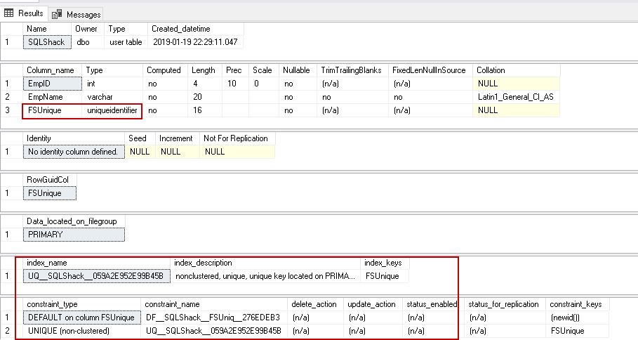 We can verify the table property using the sp_help ‘tablename’ command. It creates the unique non-clustered index along with the unique, default constraint on this new column. It ensures the unique values in the table. It also ensures the performance benefit as well due to the non-clustered index.