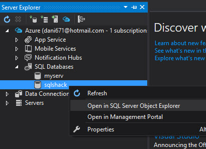 Figure 12. Connection to Visual Studio Click on the Server Explorer to verify the existing Azure objects