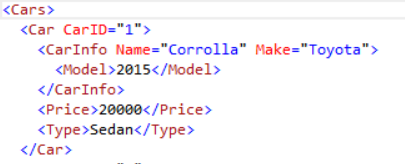 Suppose we want to retrieve the values for the nested CarInfo, Price and Type elements of the parent Car element, we can use the following script: