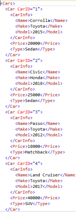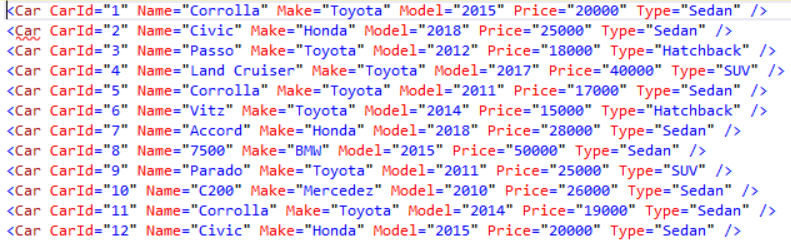 Save the above XML document with the name Cars.xml. In the next section, we will load this XML script into the SQL Server and will see how to create a table from the XML Document.